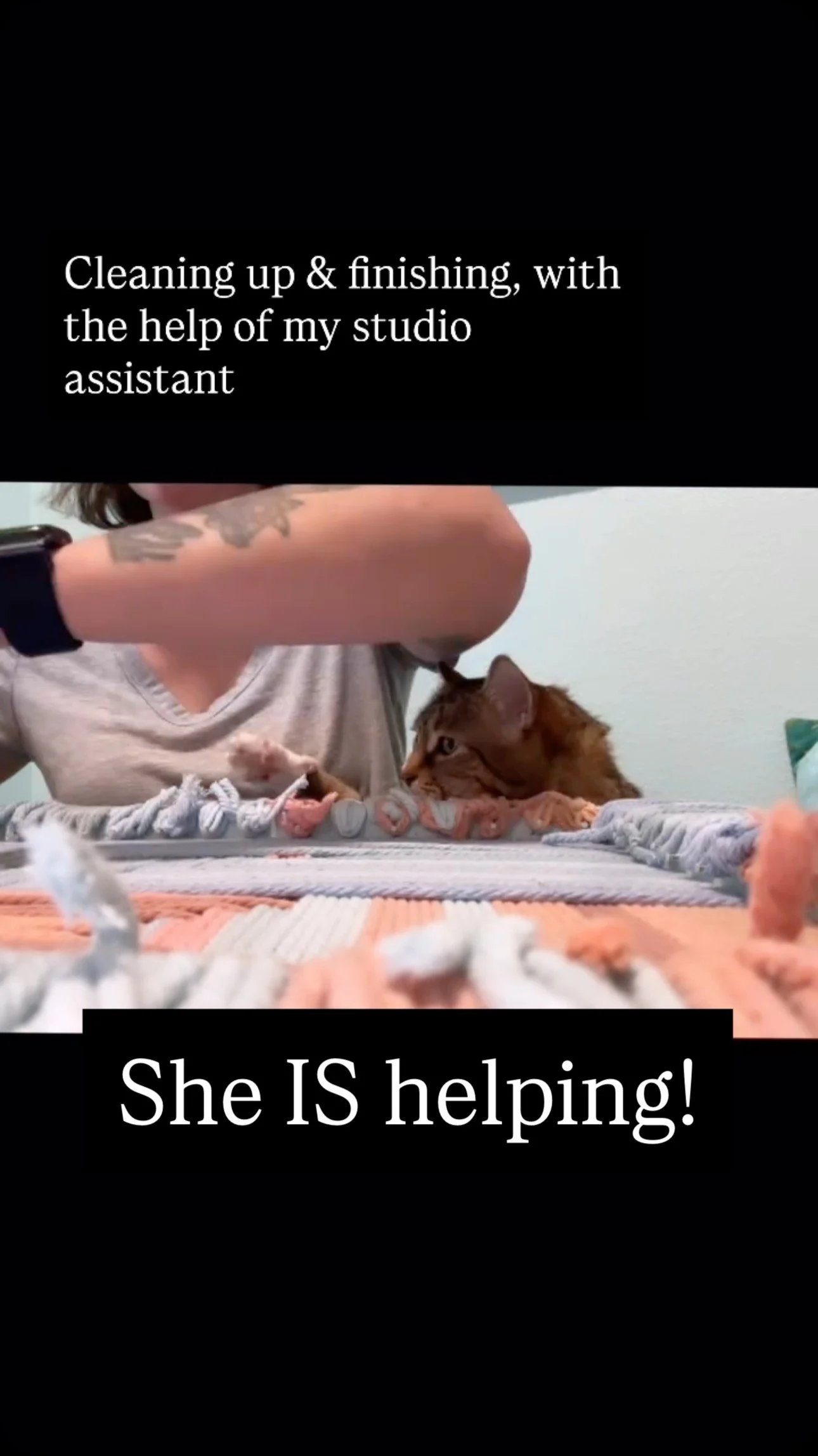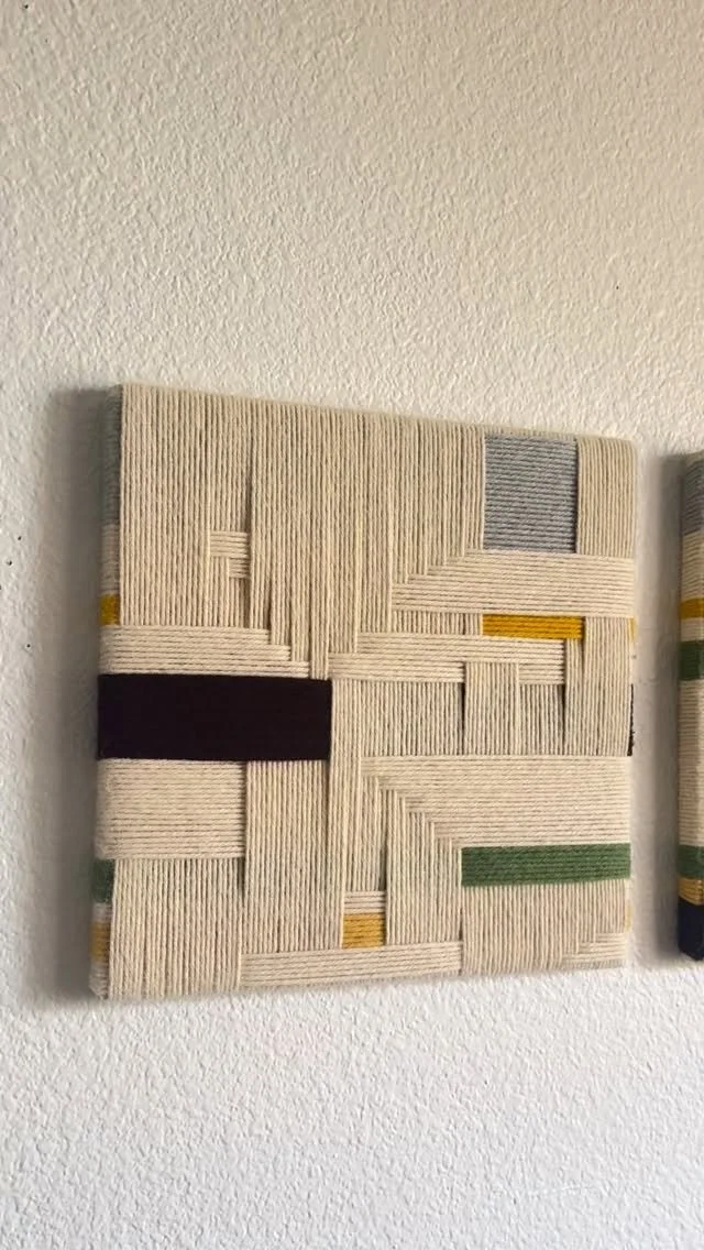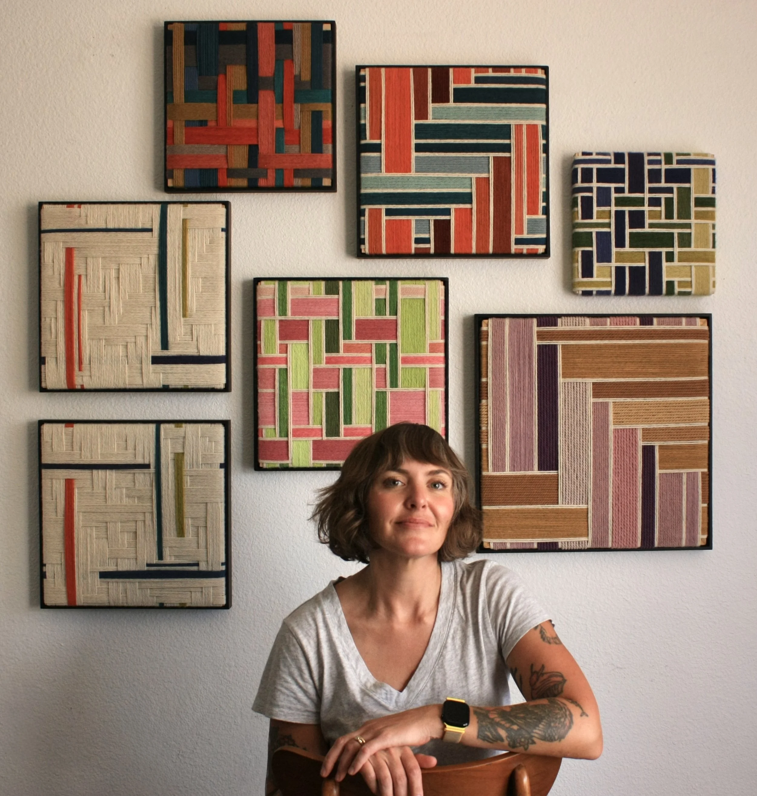 Kate shifted to creating woven wall pieces after leaving a career as an analyst. Inspired by a need for unique home decor, she develops custom designs with texture and geometric shapes using fabric and fibers. Her pieces are made of 100% cotton or wool, and adorn wooden frames. More detail regarding the process can be found on the FAQ and Process page.